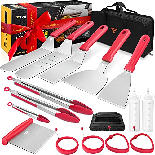 【FiveJoy 17 PCS Griddle Accessories Kit】: Extensive set of must-have griddle tools including 2x Oversize Griddle Spatulas, 1x Flat Grill Spatula Turner, 1x Flat Grill Spatula Flipper, 1x Cleaning Scraper, 1x Wide Chopper, 3x Grill Tong (14”+12”+7”), 2x Circle Silicone Egg Rings, 2x Heart-Shaped Egg Rings, 2x Chef Squeeze Bottles, 1x Flat Grill Cleaning Brush, 1x Carrying Bag to keep your tools protected and organized.
