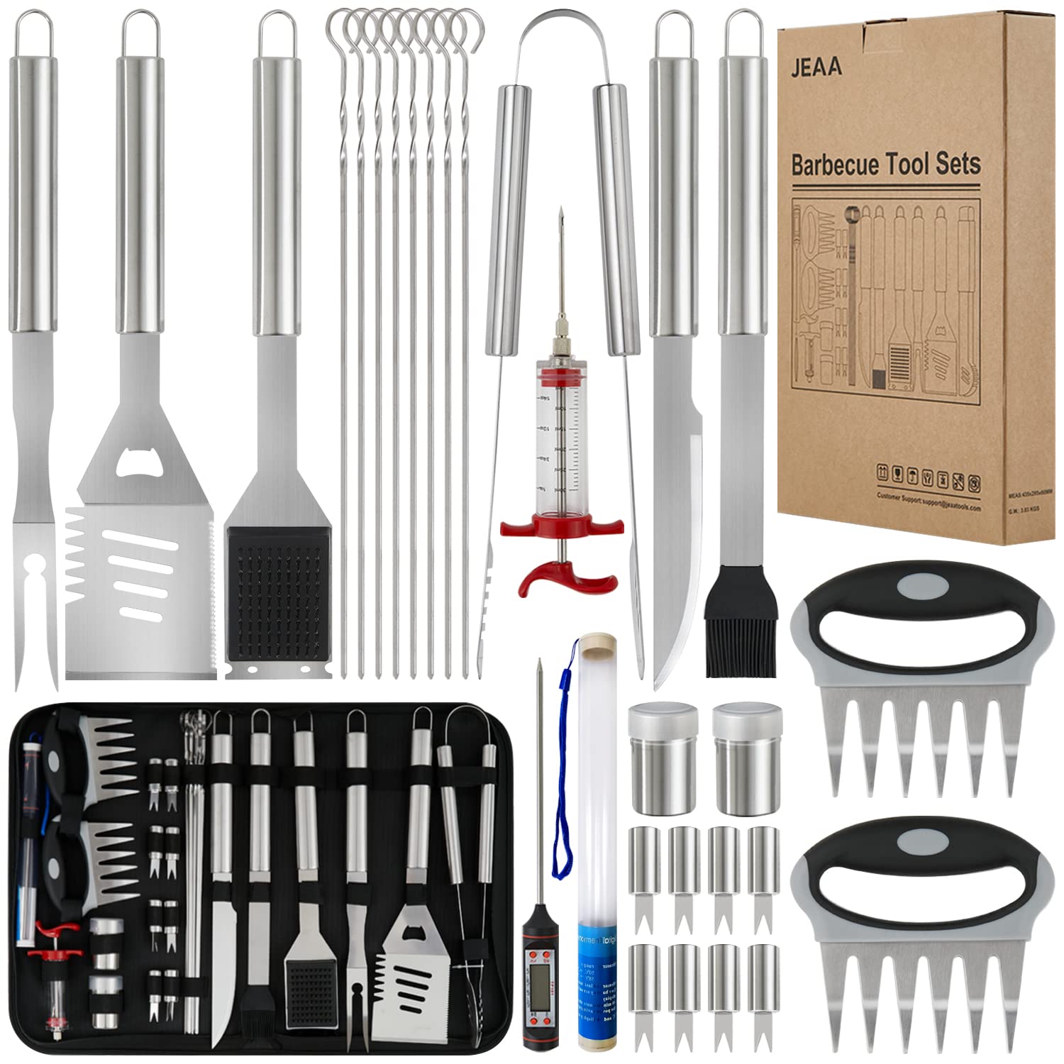 29-PIECES BARBEQUE GRILL ACCESSORIES: Maximize your grilling experience with JEAA professionally crafted BBQ grill set. This barbecue grill kit includes everything you need for a perfect barbeque. These BBQ accessories tools include; 1* Multifunctional Spatula, 1* Tongs, 8* Skewers, 2* Meat Claws, 1* Silicone Basting Brush, 1* Fork, 1* knife, 1* Cleaning Brush, 2* Salt & Pepper Shaker, 8* Coln Holder, 1* Injector, 1* Meat Thermometer, and a Heavy-duty Storage Bag.