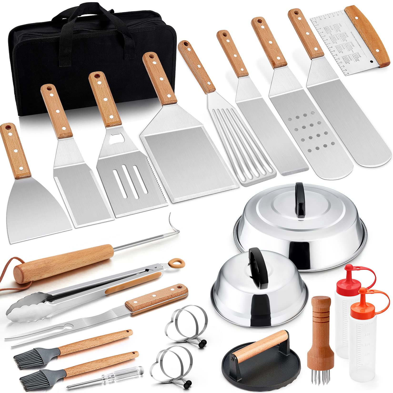 【VALUE GRIDDLE SET】 Package Included: 2 x Melting Dome ( 12”, 9” ), Long Griddle Spatula, Perforated Spatula, Multipurpose spatula, Burger Turner, Fish Turner, Griddle Spatula, Slant Edge Scraper, Bench Scraper, Narrow Turner, Cast Iron Griddle Press, Pigtail Food Flipper ( Right Handed ), Kitchen Tong, Grill Fork, Meat Tenderizer, 2 x Basting Brushes, 2 x Squeeze Bottles, 4 x Egg Rings, Storage Bag, Screwdriver